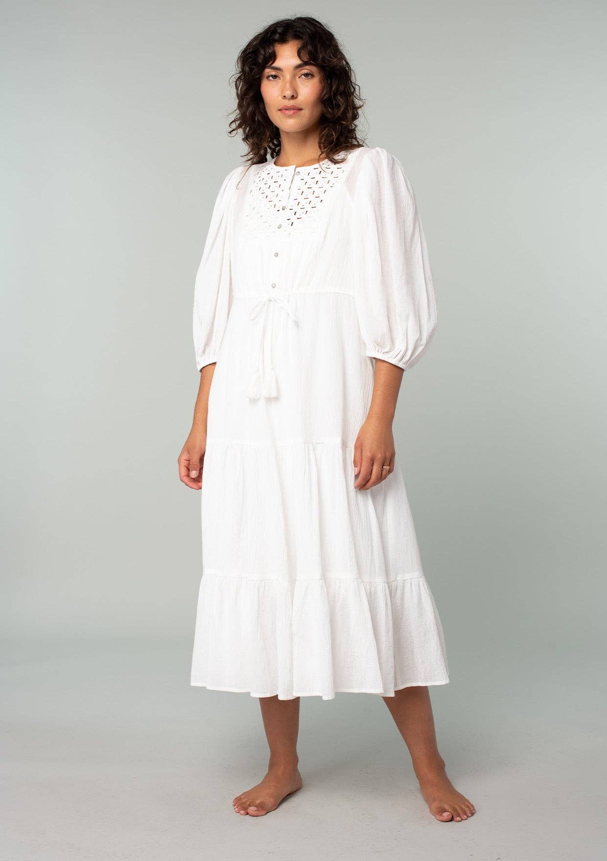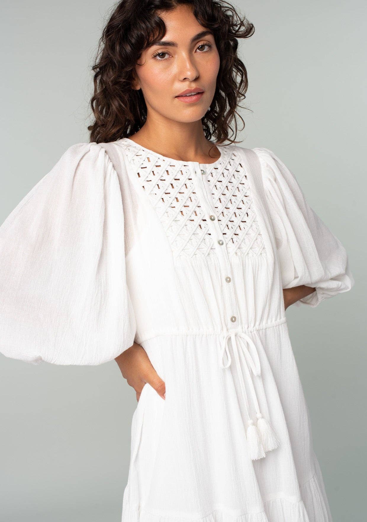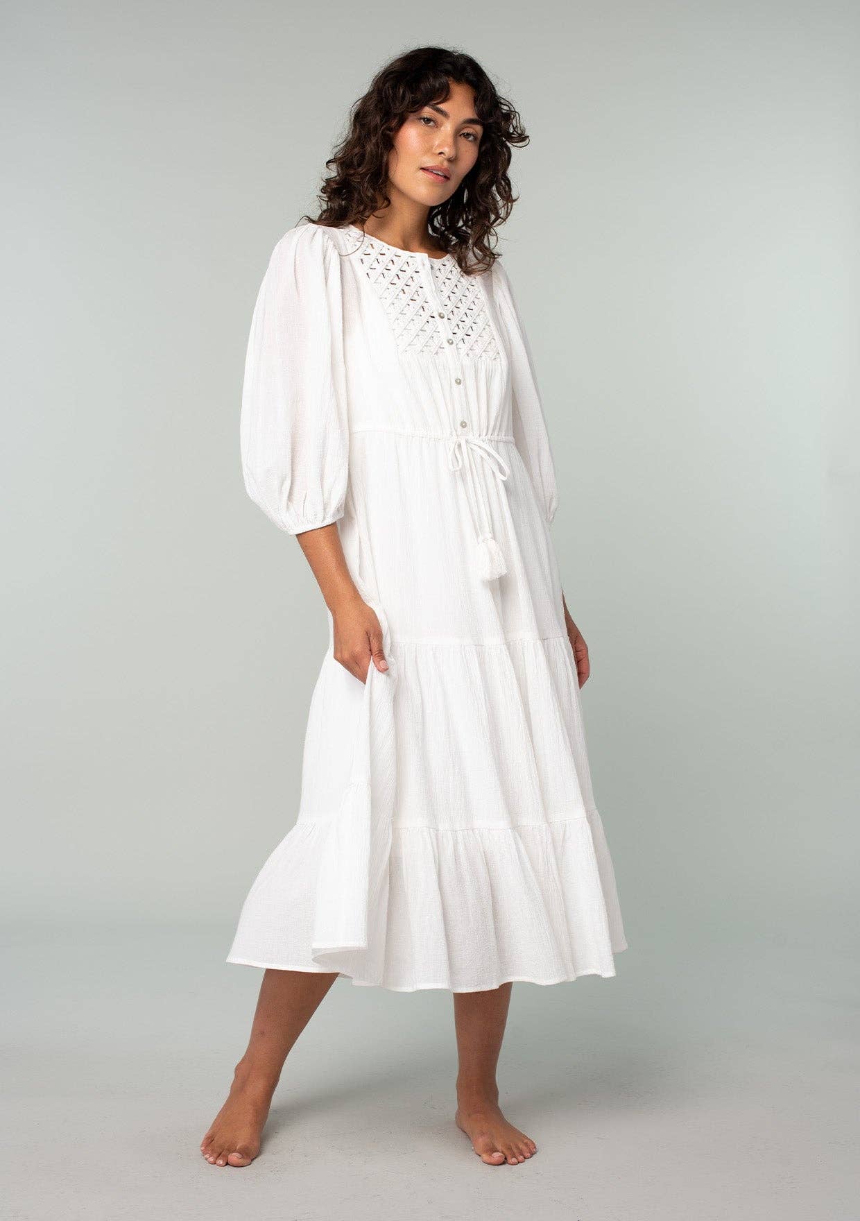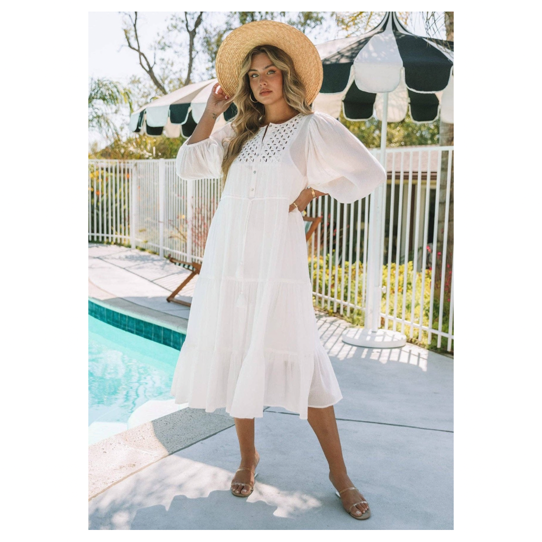 Beachy white timeless cotton gauze midi dress featuring a round neckline, 3/4 balloon sleeve, and a tiered skirt. Features a lattice yoke, functional half button front, elastic cuff, and drawstring tassel tie. This best-selling beach dress will be a staple at your boutique for years to come. Includes detachable lining. 100% Cotton