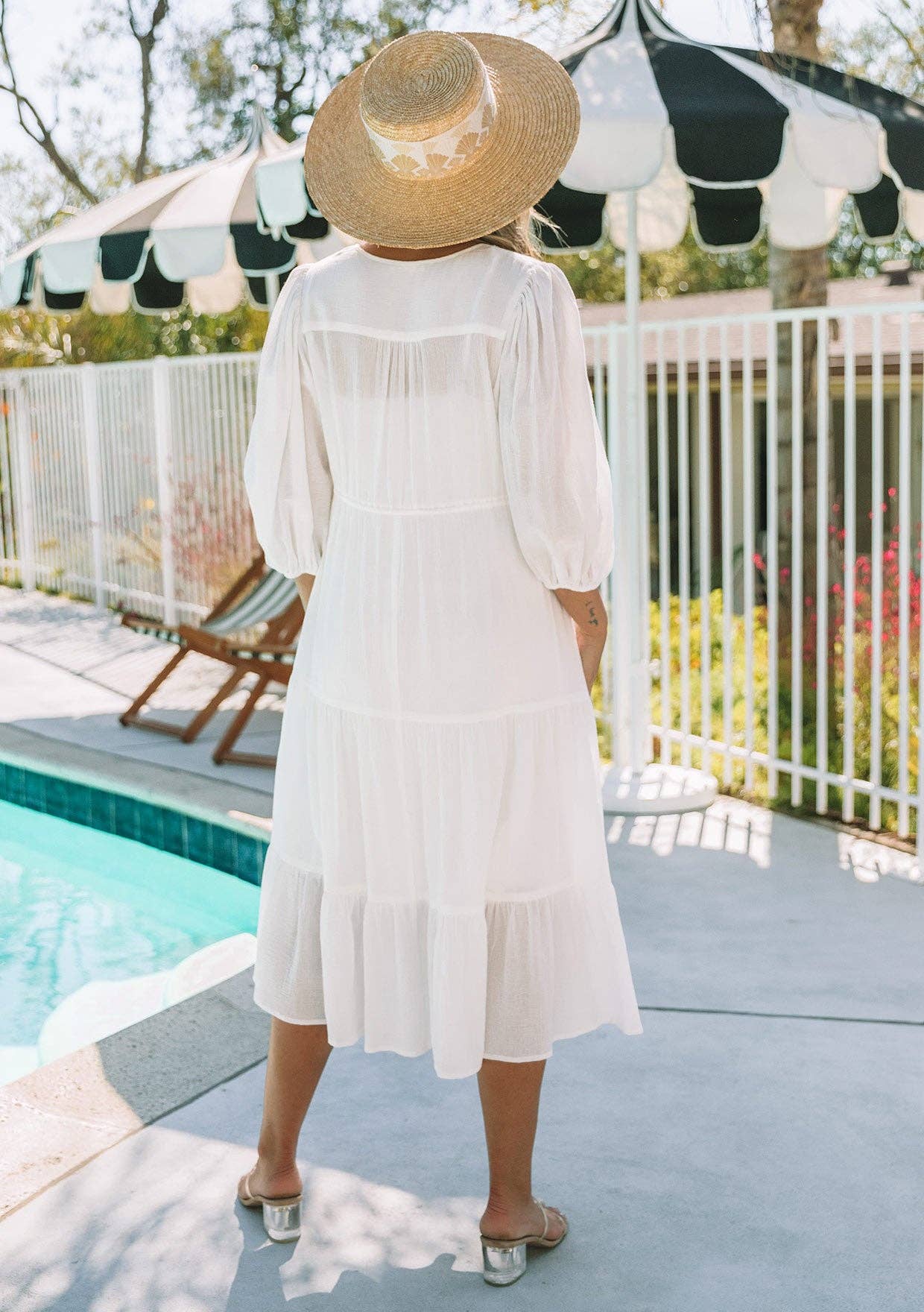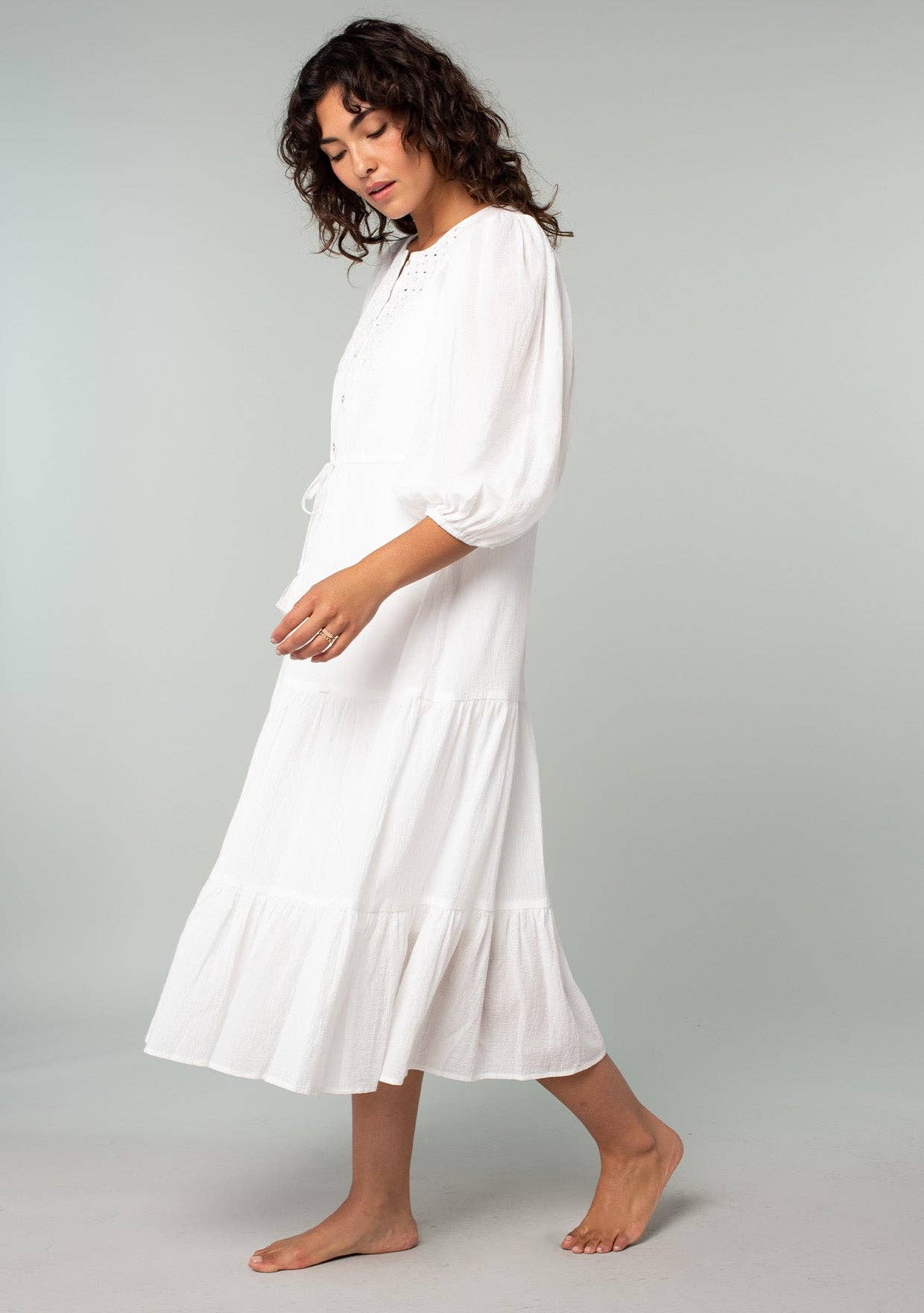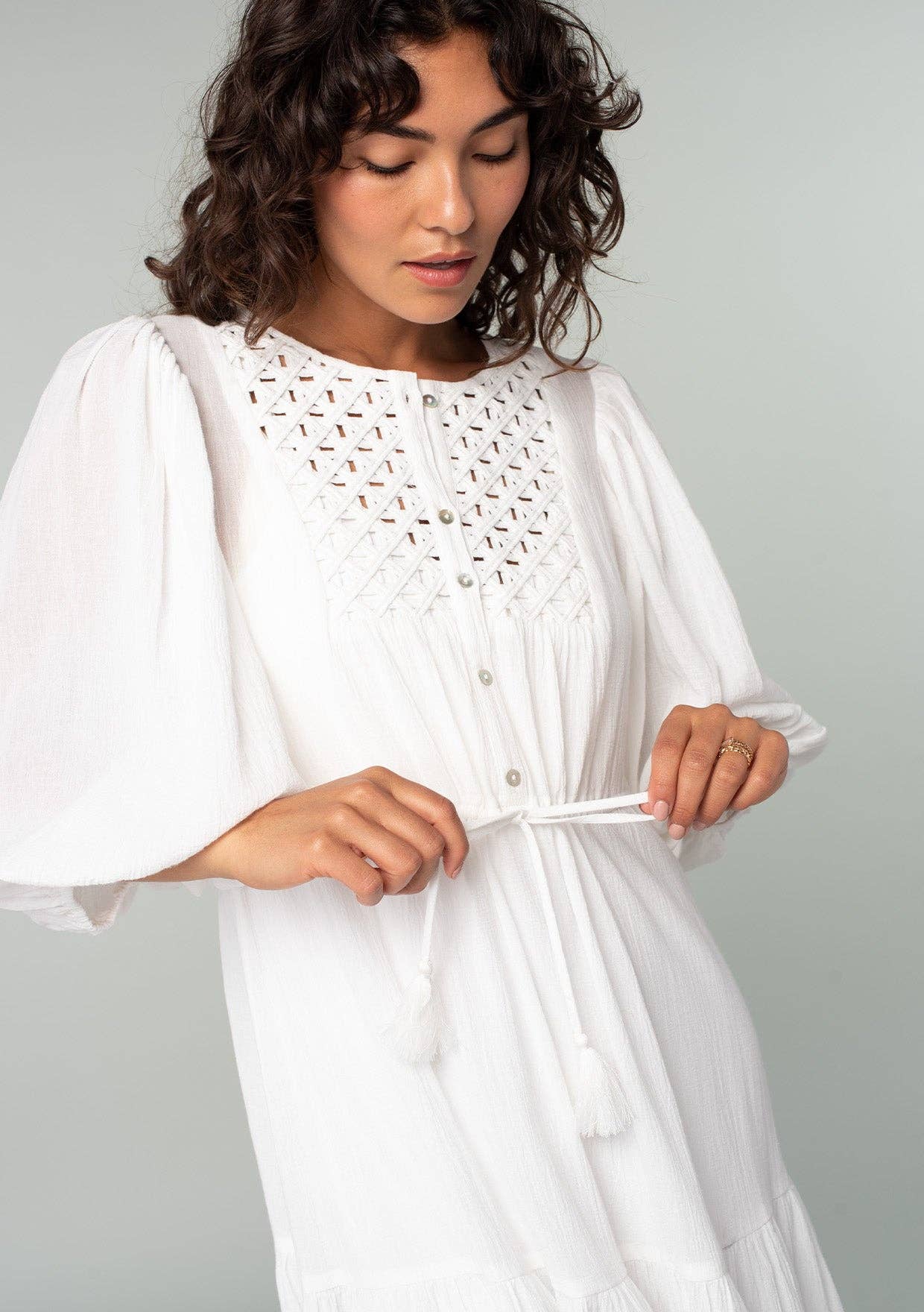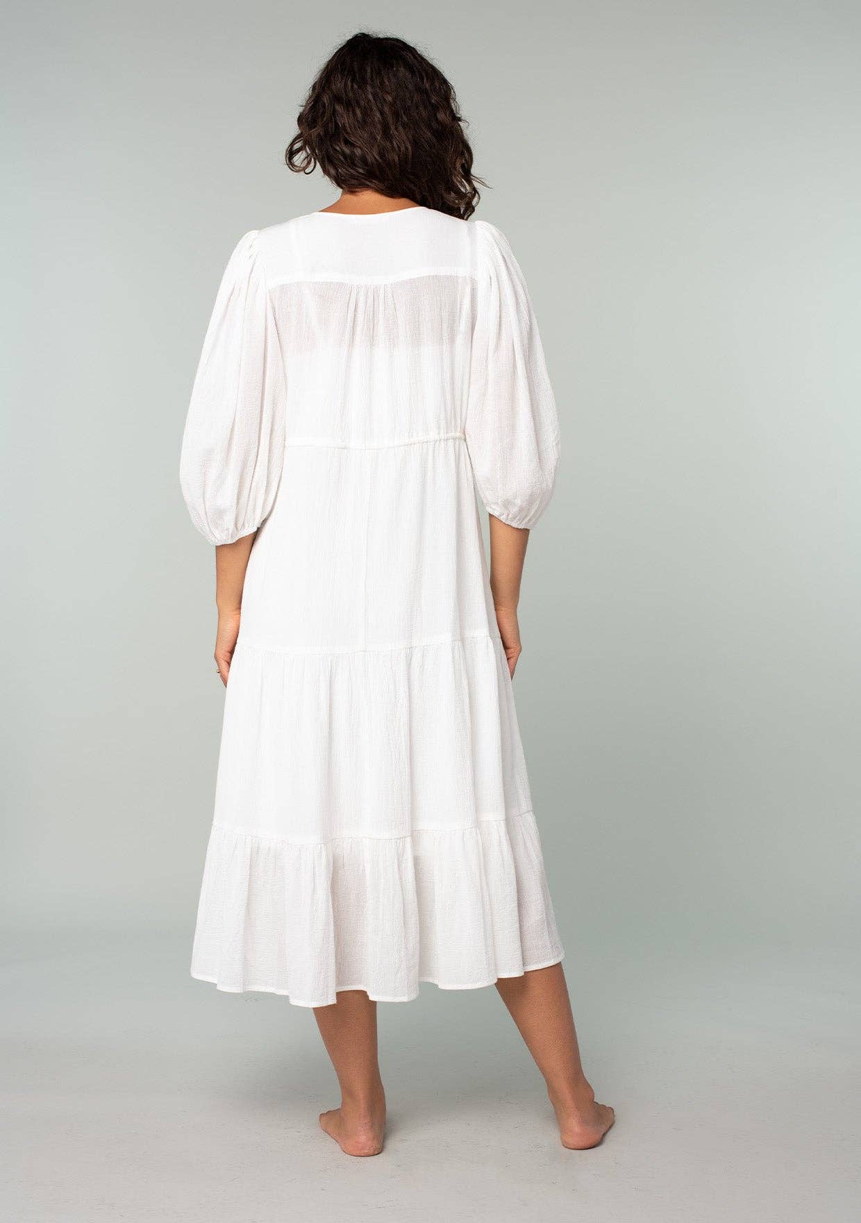 Beachy white timeless cotton gauze midi dress featuring a round neckline, 3/4 balloon sleeve, and a tiered skirt. Features a lattice yoke, functional half button front, elastic cuff, and drawstring tassel tie. This best-selling beach dress will be a staple at your boutique for years to come. Includes detachable lining. 100% Cotton