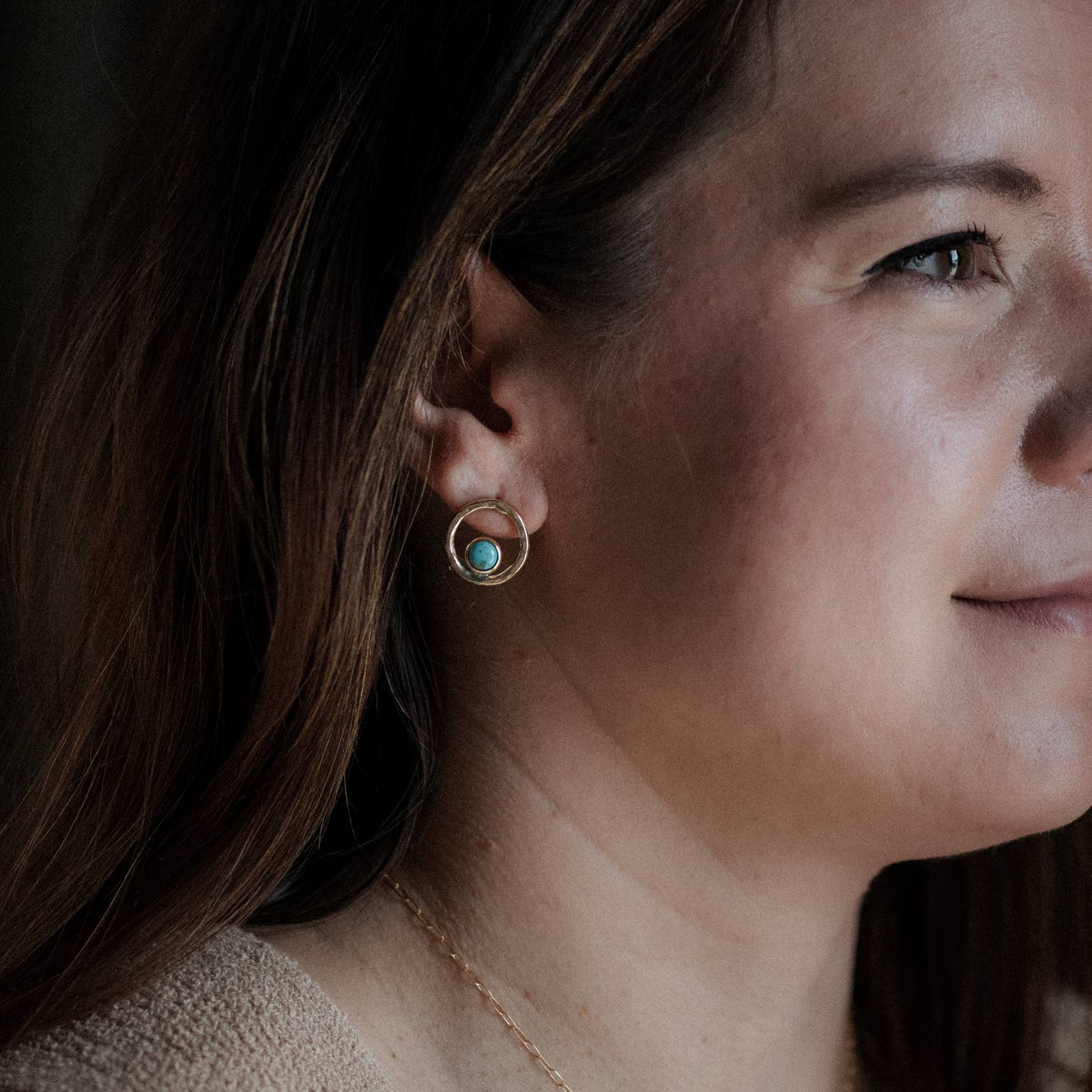 6mm bezel set turquoise pieces sit on solid, textured brass pieces. All soldered by hand and connected to sterling silver stud posts.