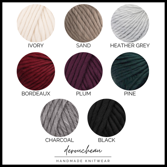 Designed and hand knit by Deanna DeRoucheau in Boston, MA. 100% Merino wool. Ethically sourced materials + sustainable fiber. Available in sand & bordeaux color.