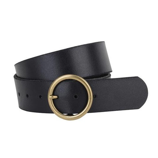 A classic leather belt with circle copper-toned buckle. Width: 1.75". Comes in black & tan. Imported.