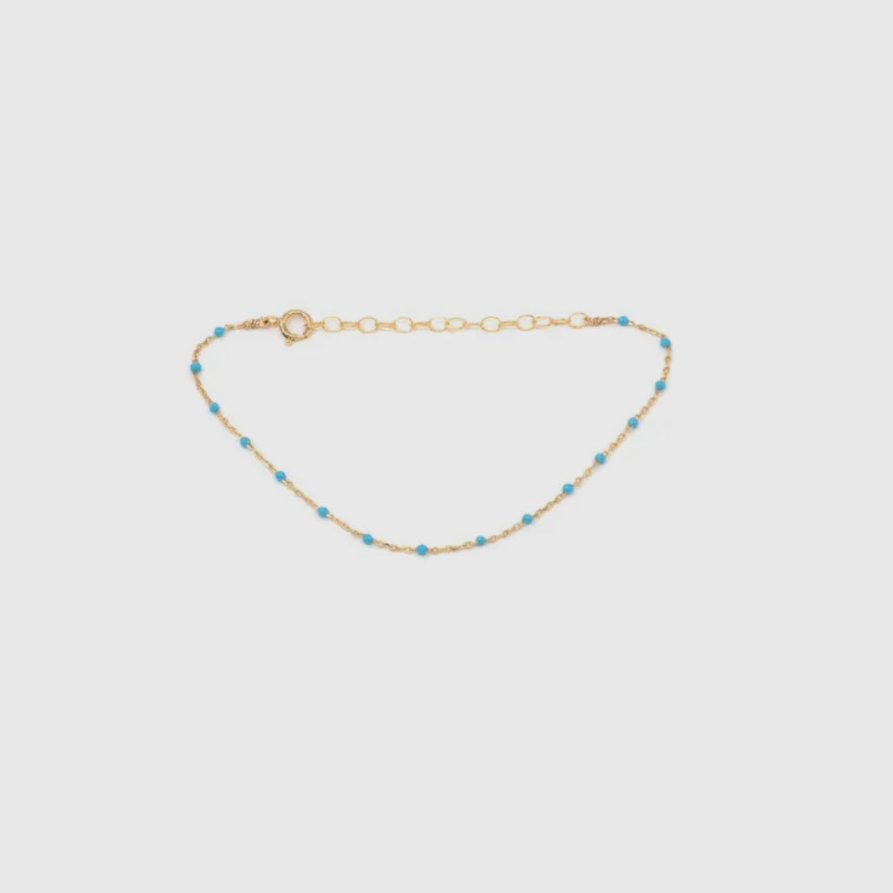 Very dainty gold filled chain with a tiny pop of color. Size: 5.5" long with 1.5" extender. It's the middle bracelet on the model. Designed and made in California.