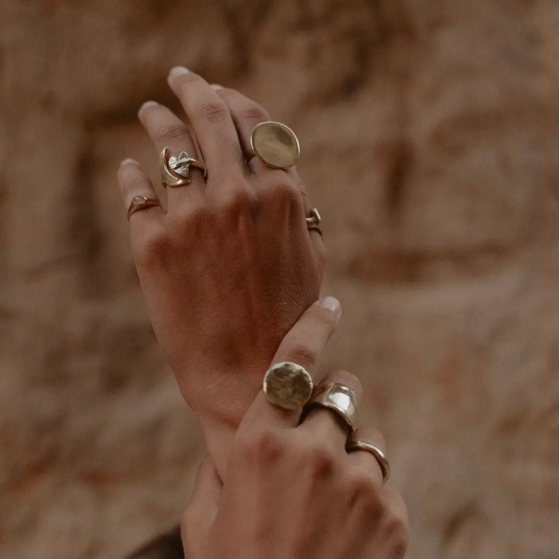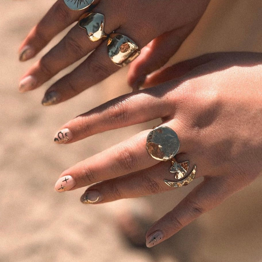 Named for the goddess of the hunt and the moon, Artemis, this handmade ring is full of texture and shine. Its adjustable design and crescent moon and heart motifs make for a timeless addition to your wardrobe. Hand crafted from recycled brass by expert artisans in Southern California.