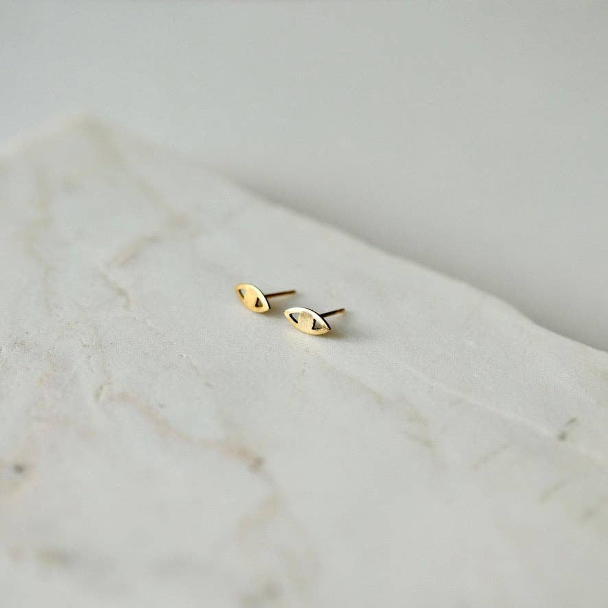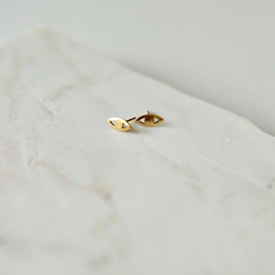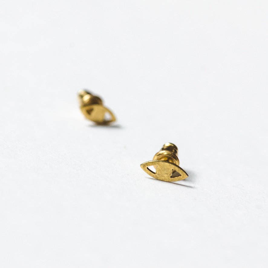 Hand fabricated small eye shaped stud earrings The third eye is known to be a symbol of the mind, intuition, thought, and dreams in many different cultures and religions. Considered to be the sixth chakra of the body,it is used as a symbol in talismans for the purpose of protection against evil onlookers. This handcrafted brass pendant on the gold plated chain, guards one against misfortune and brings forth good luck. 5 mm, 24k gold plated surgical steel posts (hypoallergenic) bullet clutch backings made by hand and made to order in Brooklyn NY using sustainable and ethical jewelry practices