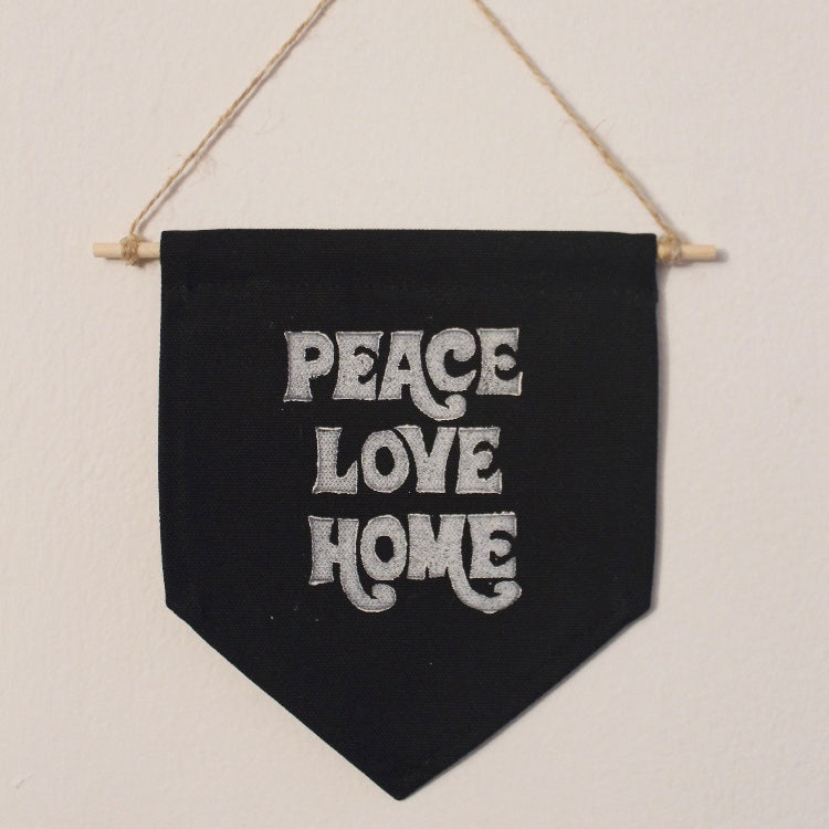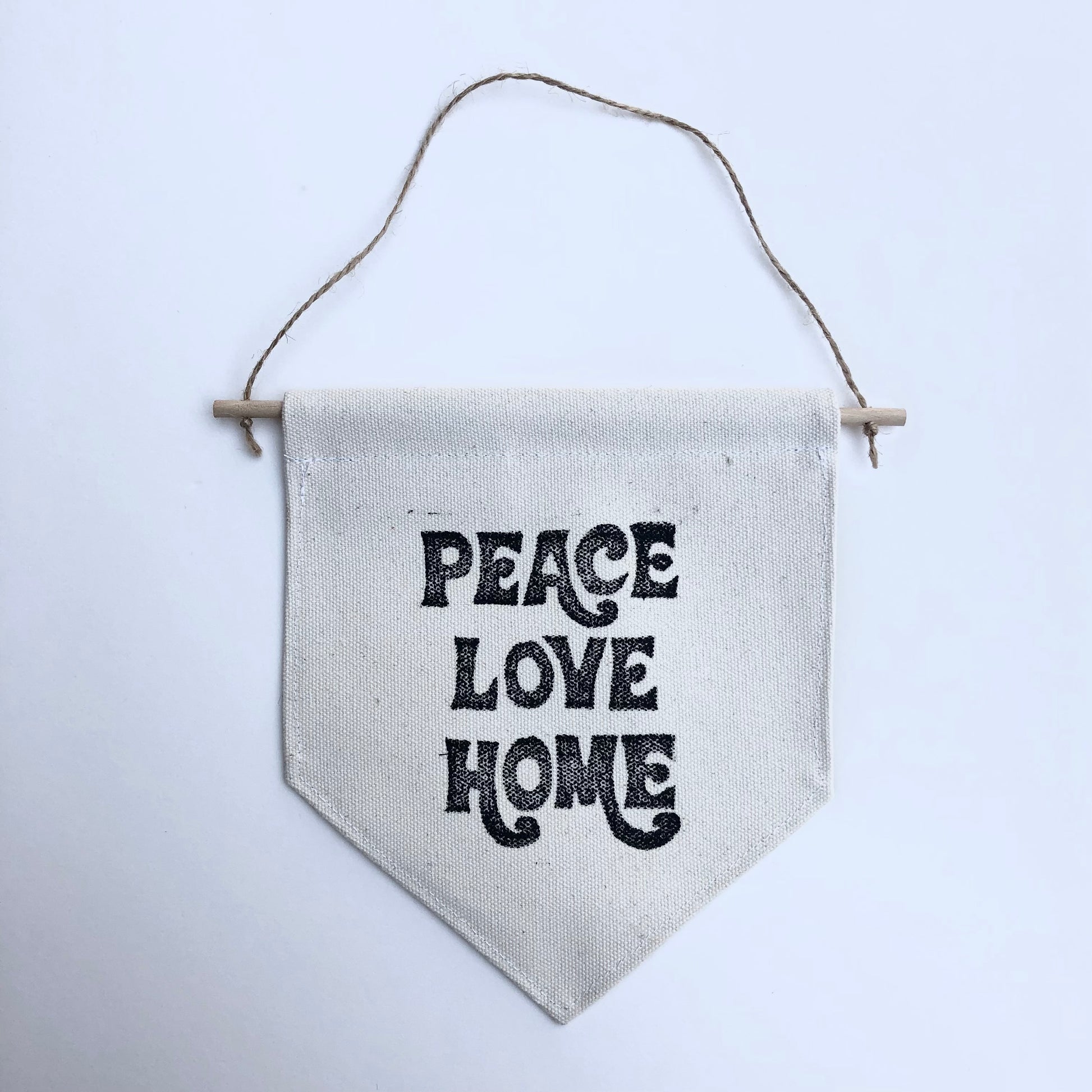 Hand printed canvas banner. The perfect sentiment to your space - Peace Love Home. Banner measuring approximately 6" wide, 13" total length with string. Sustainably handmade by Jenna Aliyah in New Jersey.