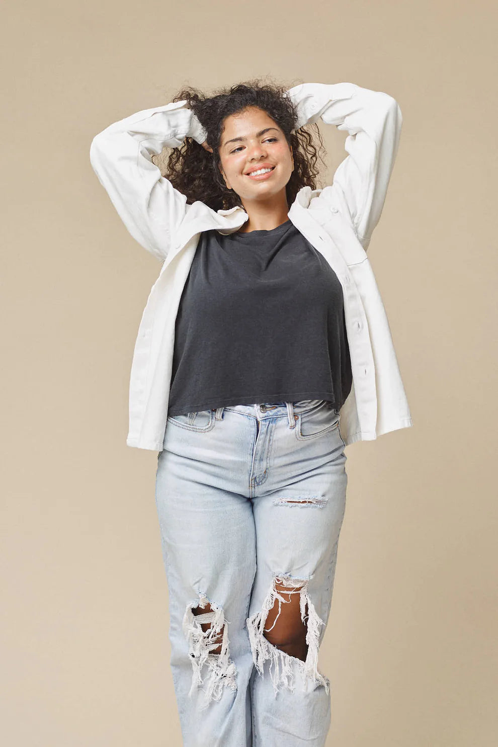 The finished garment is washed in color, rather than dying the fabric prior to cutting and sewing. This results in subtle variations of color and a softer texture. Washed White is not garment-dyed.