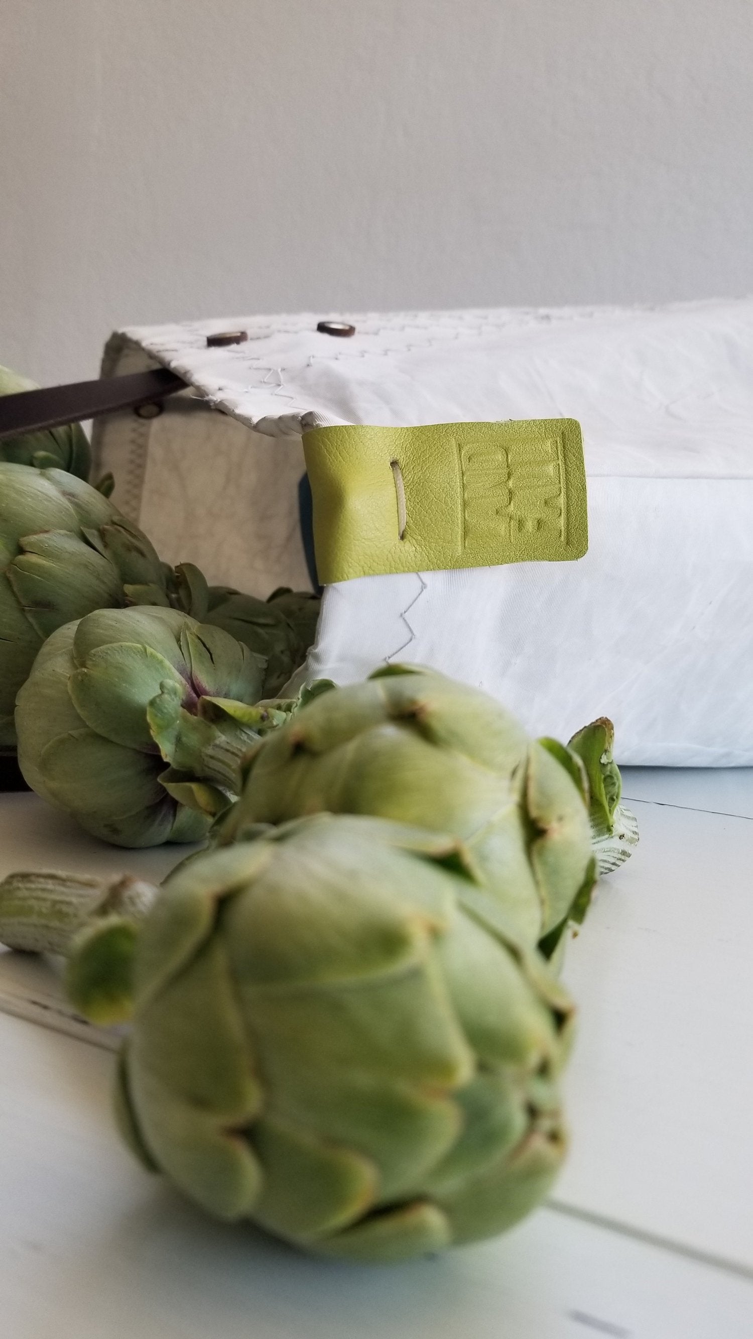 Handmade in Sausalito, CA by Emma Casey. Made with retired sails she collected from 7 years at sea traveling through the Pacific, Indian and Atlantic Oceans.