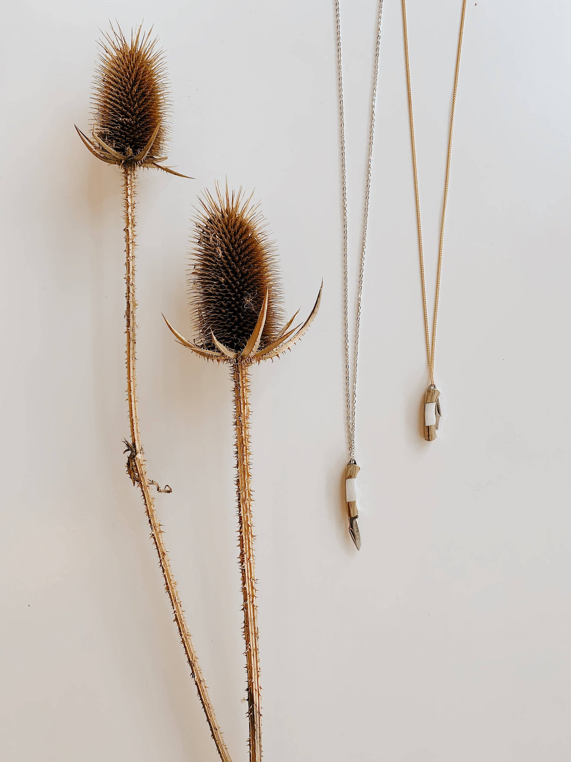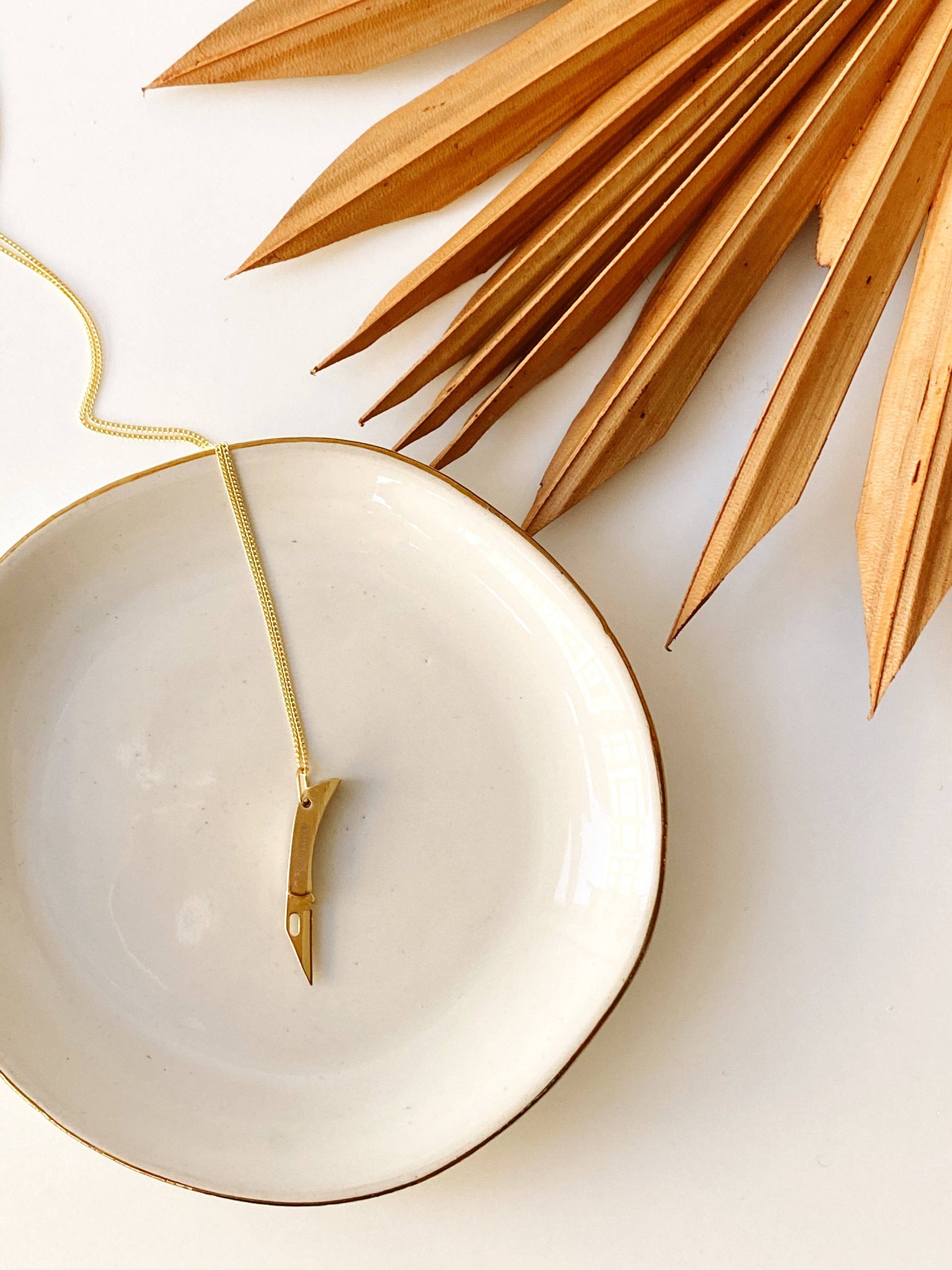 This mother of pearl Pocket Knife Necklace is so unique. Small but mighty, the pocket knife is functional. Don't bring it on the airplane! Approximately 30" long brass chain with adjustable bead to wear at whatever length you choose! Knife measures 1” in length.