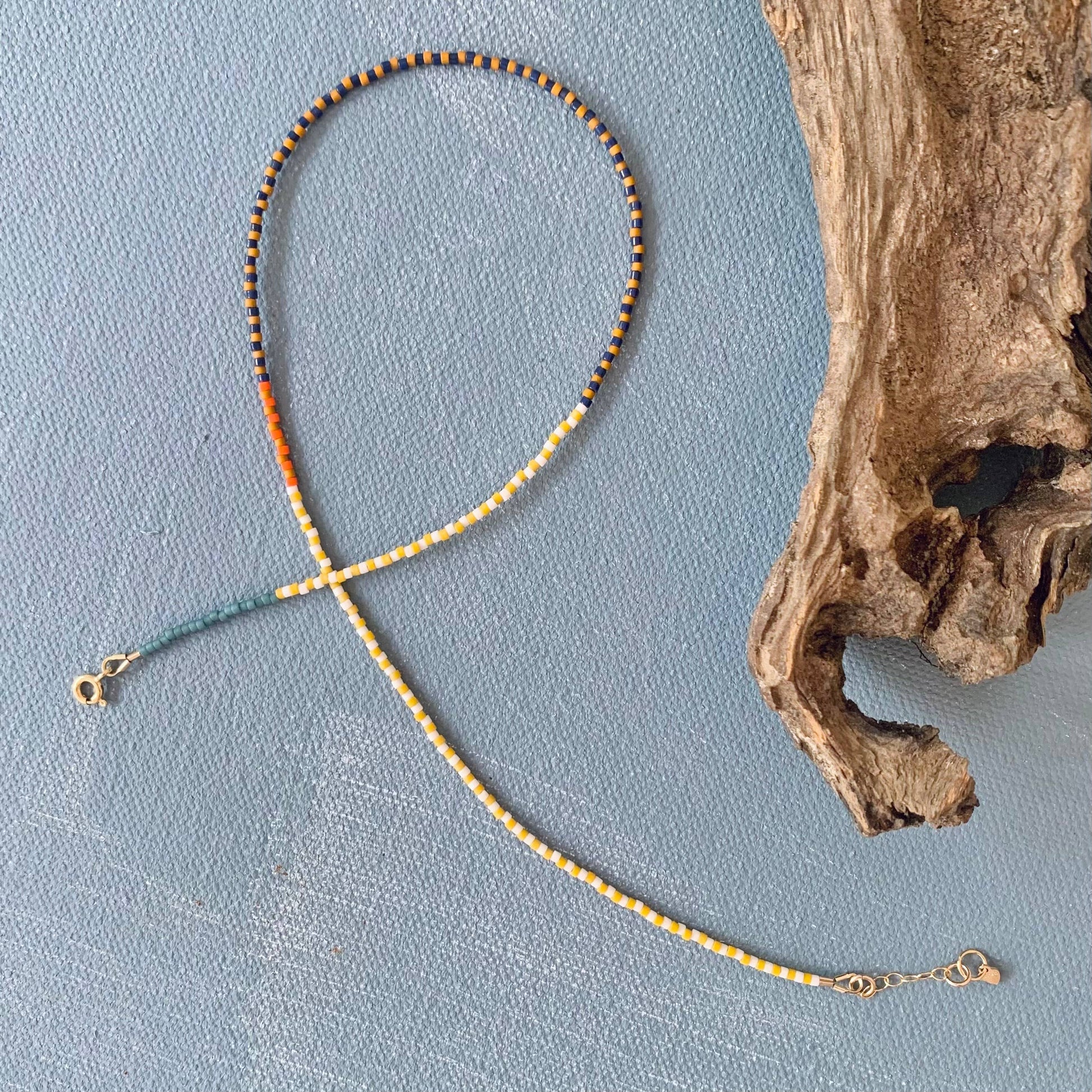 These beaded choker necklaces are meticulously crafted out of Japanese glass and high quality, durable 14k gold filled components. These are our most popular length, 15-16" and come with an extender chain.