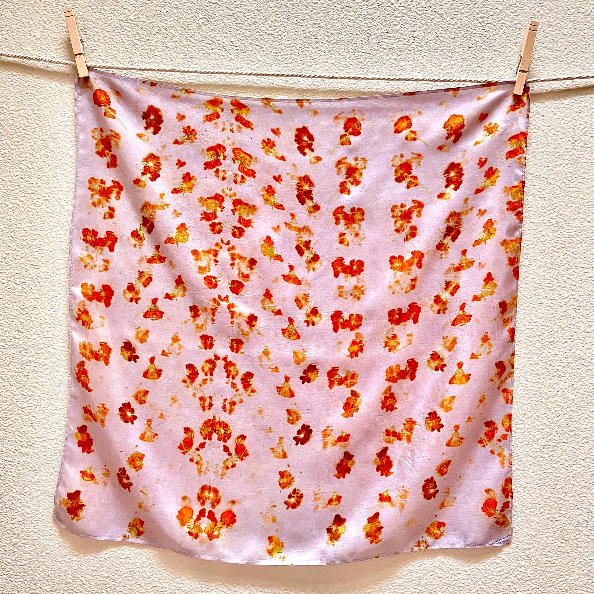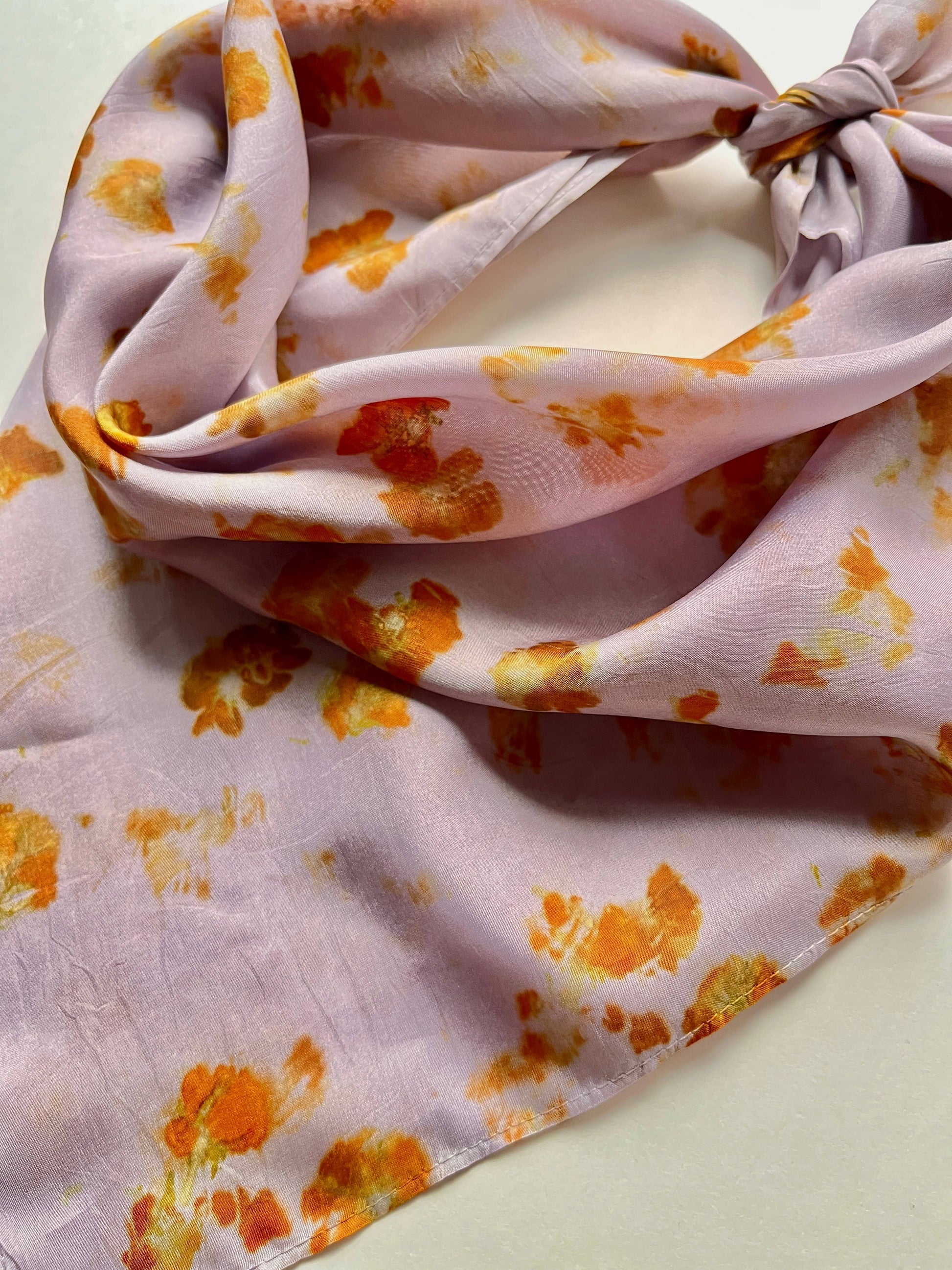 The Lilac Sun silk is eco-printed with our *homegrown* Tango Cosmos and logwood bark on a 21"x21" Habotai silk bandana with machine-hemmed edges.