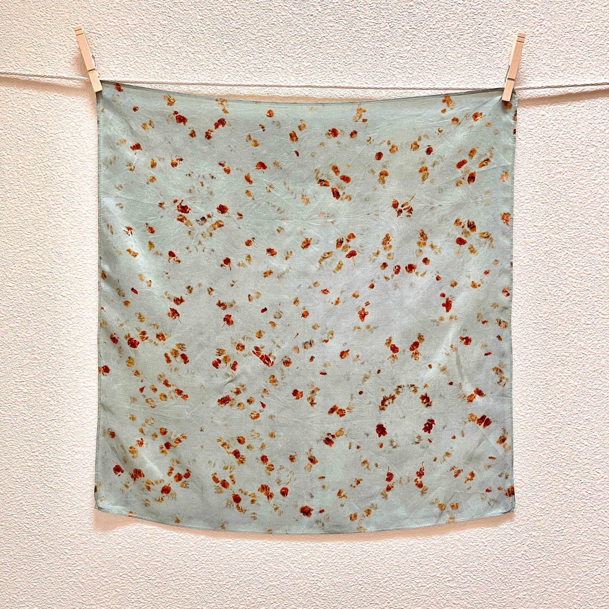 The Moonpetal silk is eco-printed with our *homegrown* Black Knight Scabiosa and Coreopsis Tinctoria flowers on a 21"x21" Habotai silk bandana with machine-hemmed edges.