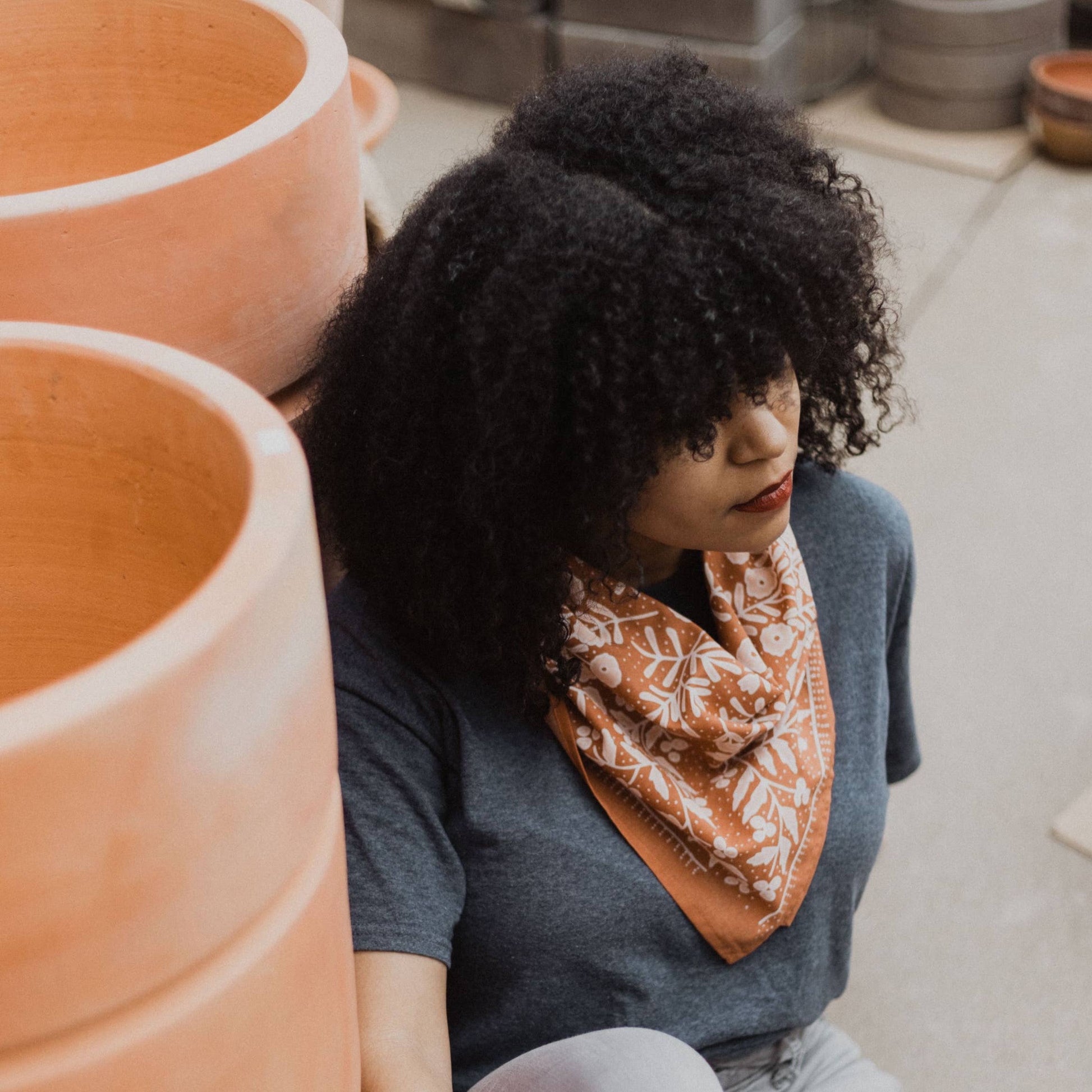 Folksy and unpretentious, Terra’s the friend who’s never going to color her hair–and she’ll never need to, because she’s completely lit up from the inside. Terra’s chestnut hue provides a striking backdrop for the sumptuous, symmetrical floral patterning that Hemlock Goods is known for, and frankly, it’s hard to keep this classic style in stock.