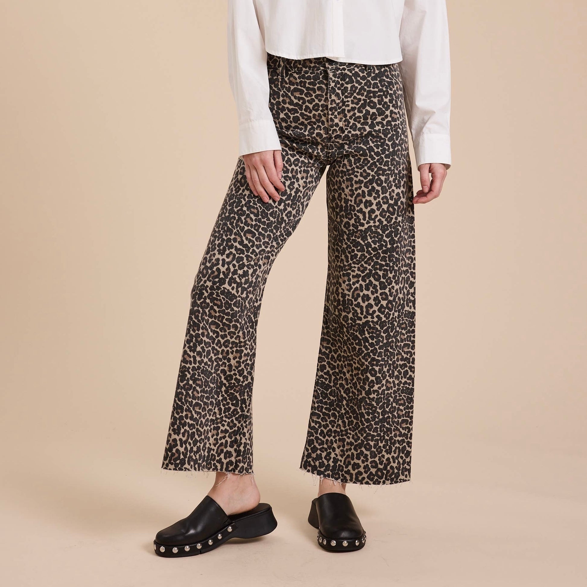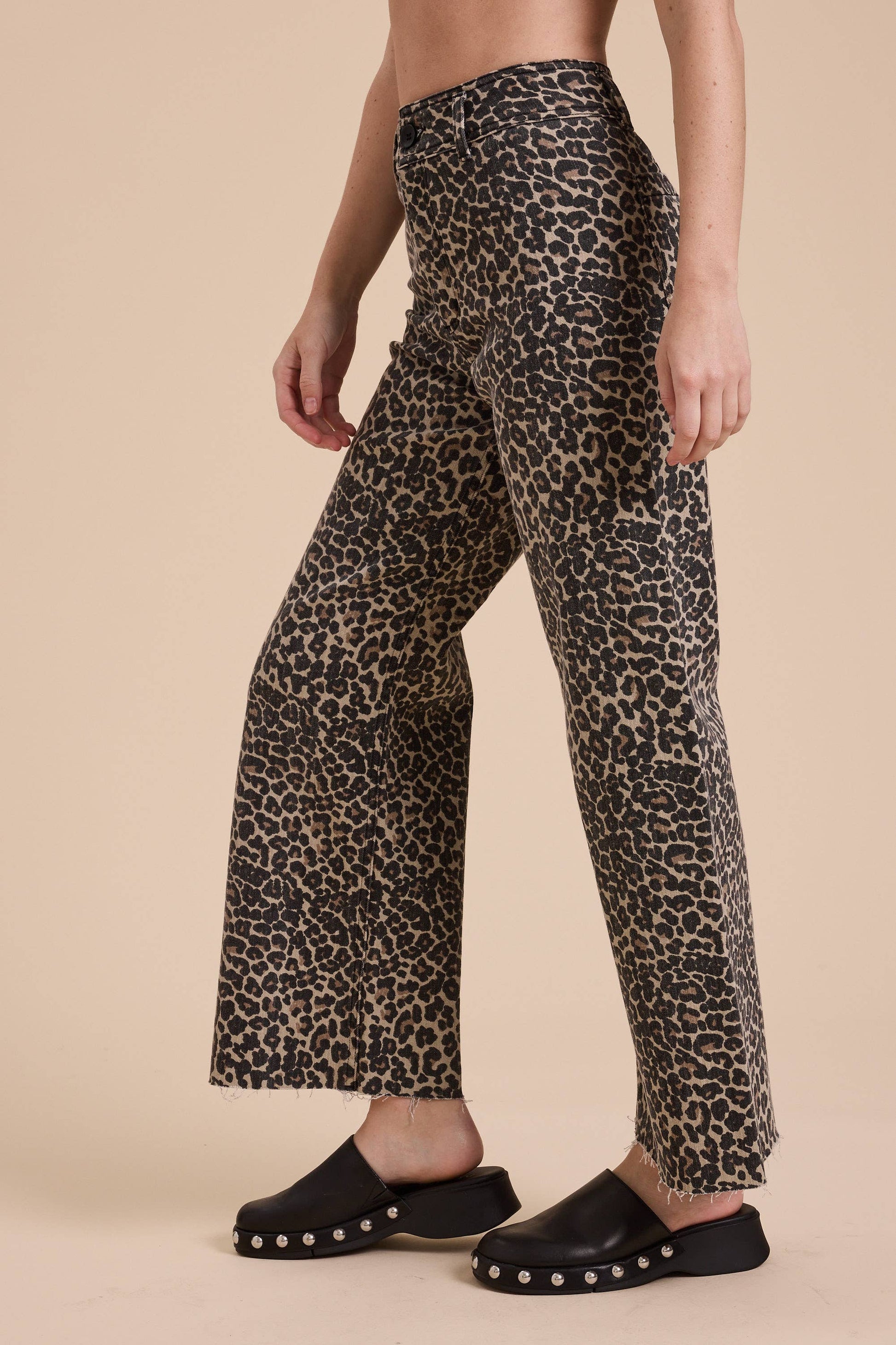 High rise, wide leg animal print pants with raw hem. Model is wearing size S Measurements taken from size S Height - 5' 7 1/2" / 175.3CM 33(Bust) - 24(Waist) - 34(Hips)