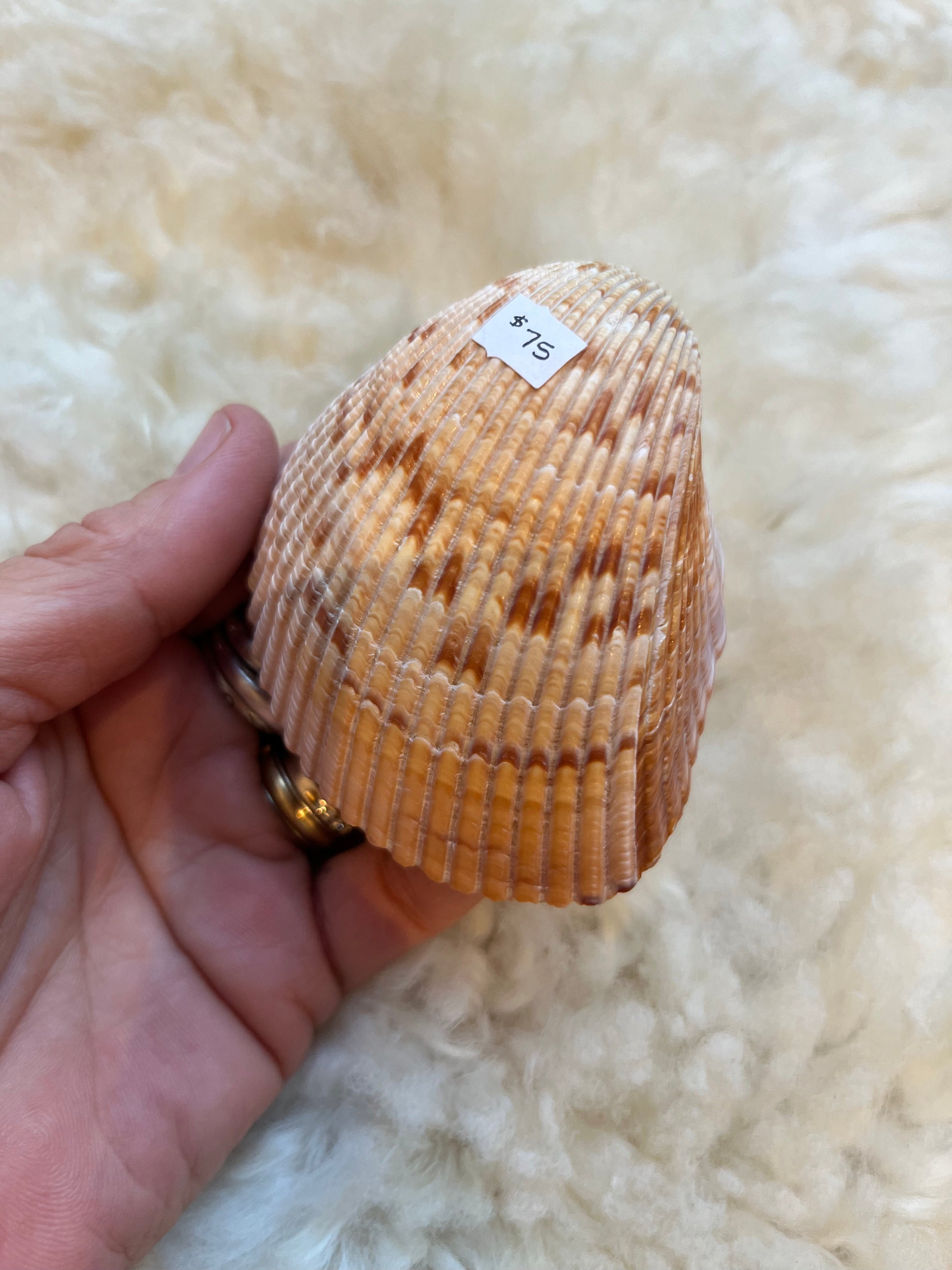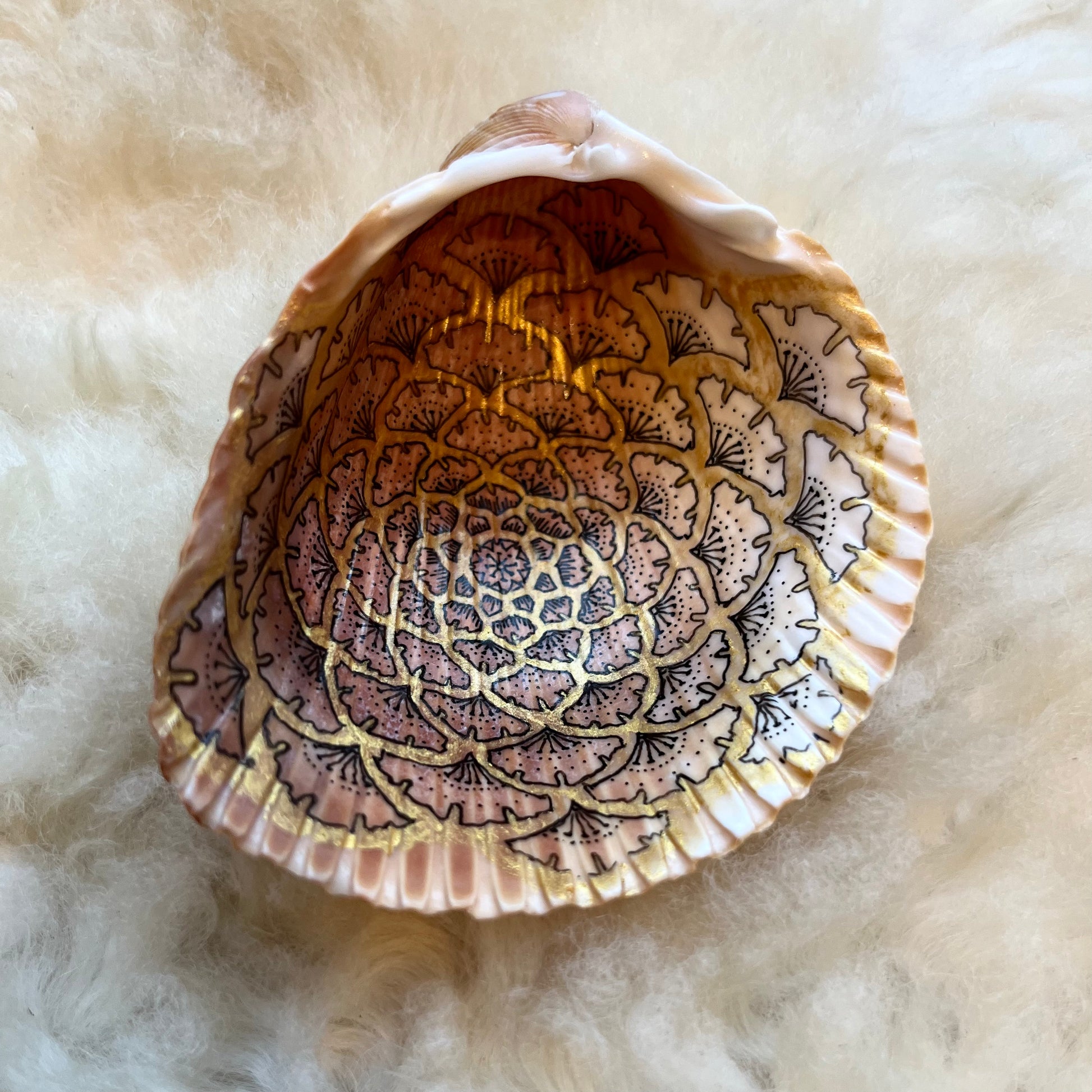 One of a kind original art on found seashell. Illustrated and painted by Shana Heller in Santa Cruz, CA. Measuring 3” x 2.5”