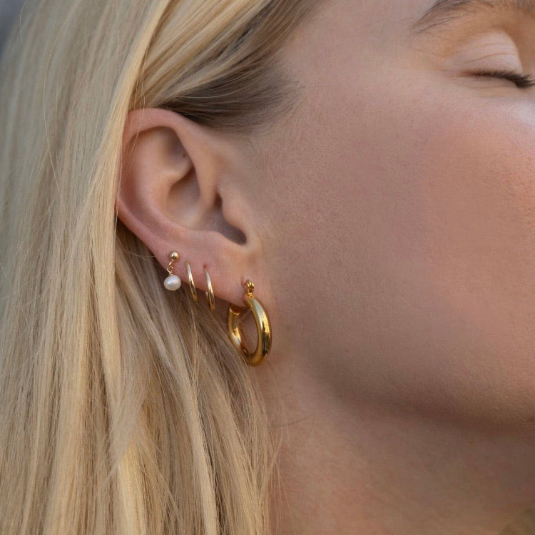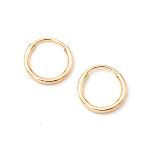 Very small (9mm) 14K gold fill hoop earrings. To put on, open the hoop to the side (rather than pulling apart) to maintain the tension in the hoop. Handmade by May Martin in Newport, CA.