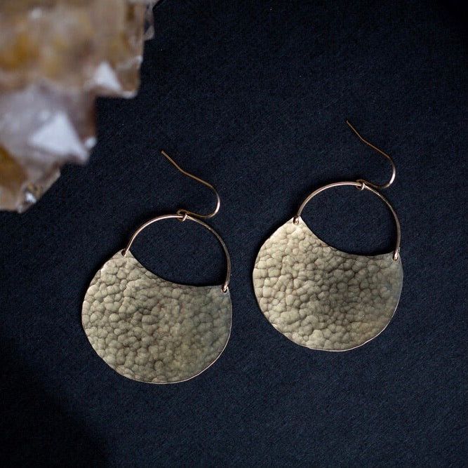 Hand cut and hammered brass with 14k gold filled ear wire. Earrings measure approximately 2” by 1 1/8”. Handmade by Ali Osbourne in Santa Cruz, CA.