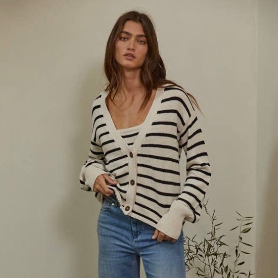 Knit Sweater Cotton Stripe V-Neck Cardigan • Natural Black